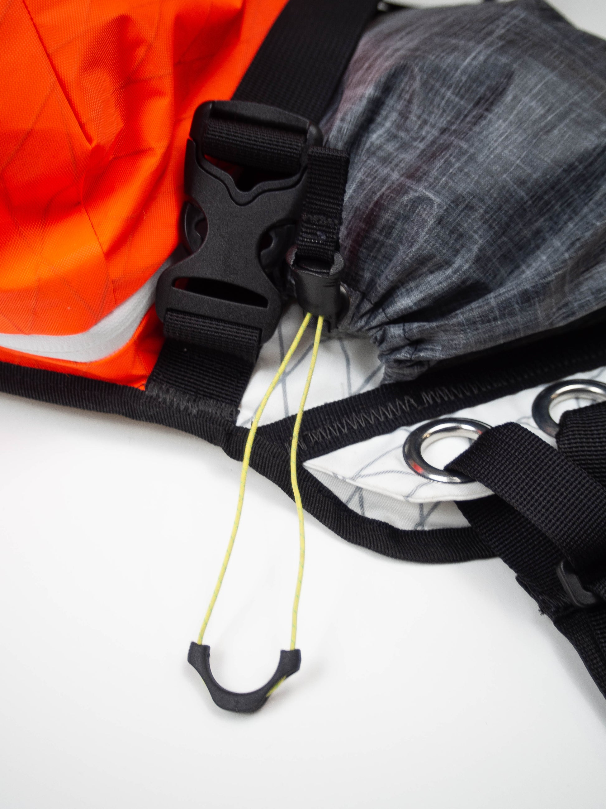 - Small loop at the top of the bag for strapping a wheel of top skate, so it sits snug against the bag (this feature is based on field testing by Harry Abel)