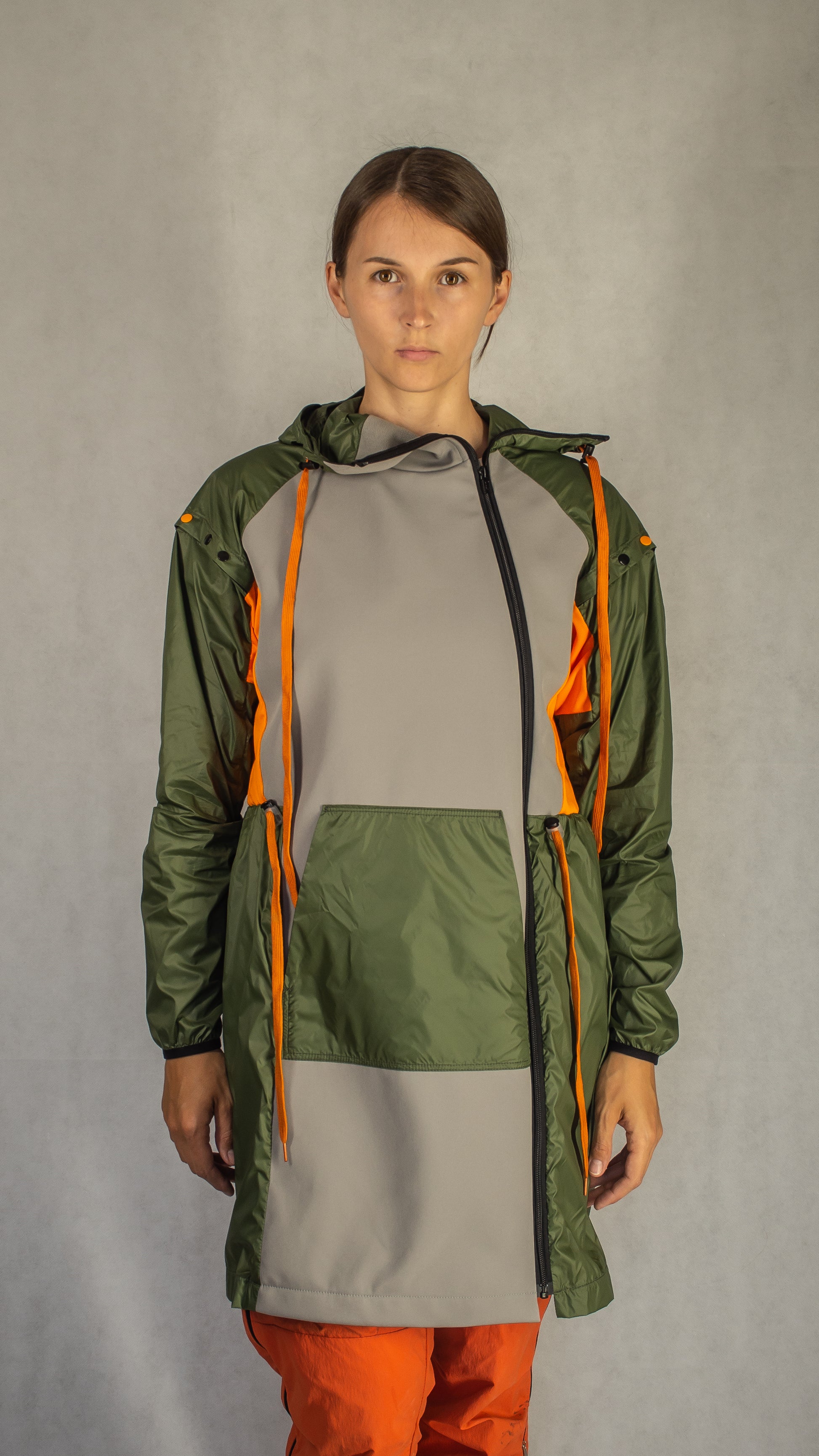 Main features: sleeves - shortsleeve/longsleeve conversion (see the demo video); hood - adjustable along the opening and in the back; waist - cinch cord allows to change fit; cuffs - elasticized; pocket - kangaroo style front pocket;